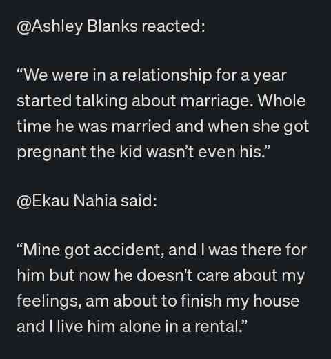 She said " He cheated 5 years ago, found out and stayed. He got into an accident, lost an arm and a leg. His side chick left him and so did I"