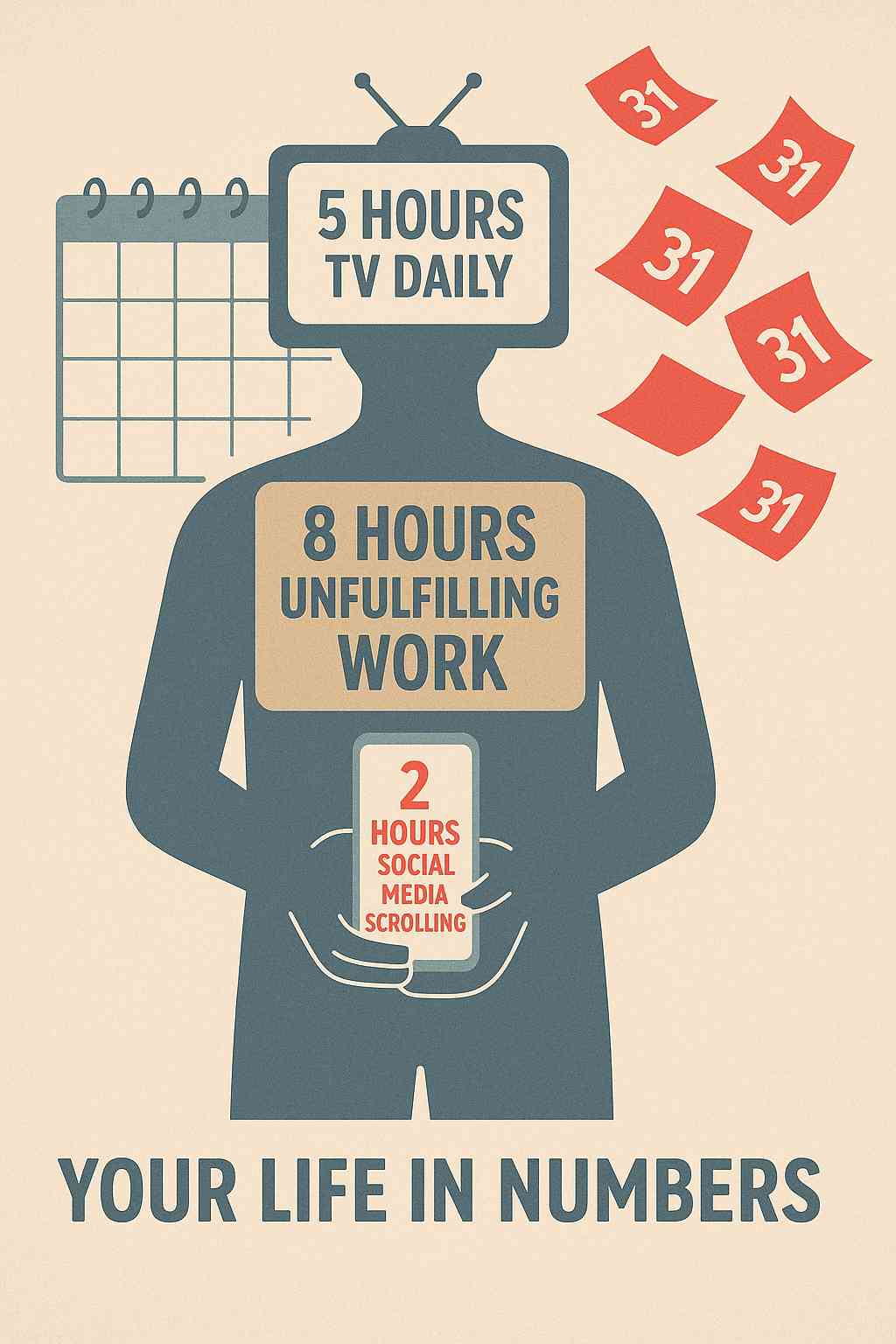 The average person watches nearly 3 hours of TV daily. That's 35 hours a week. 1,820 hours a year. In 10 years? You've watched 18,200 hours of other people's scripted lives while yours stays on pause.