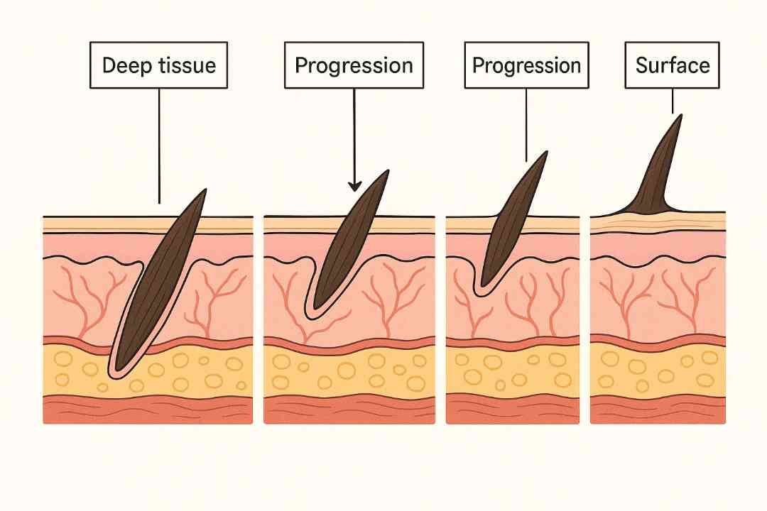 Skin layers showing a splinter's journey from deep tissue toward the surface over time.