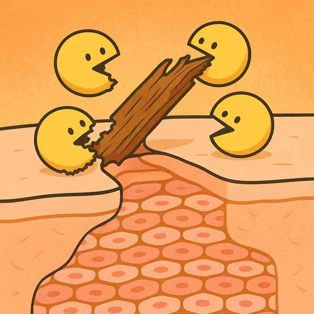 Meanwhile, special enzymes (basically tiny chemical scissors) start breaking down the edges of the splinter, making it smaller and easier to push out. Research from SpringerLink shows that macrophages and foreign body giant cells release these degradative enzymes directly onto the biomaterial surface. Wood splinters especially get attacked by these enzymes because they're organic material that your body can actually digest a little bit.