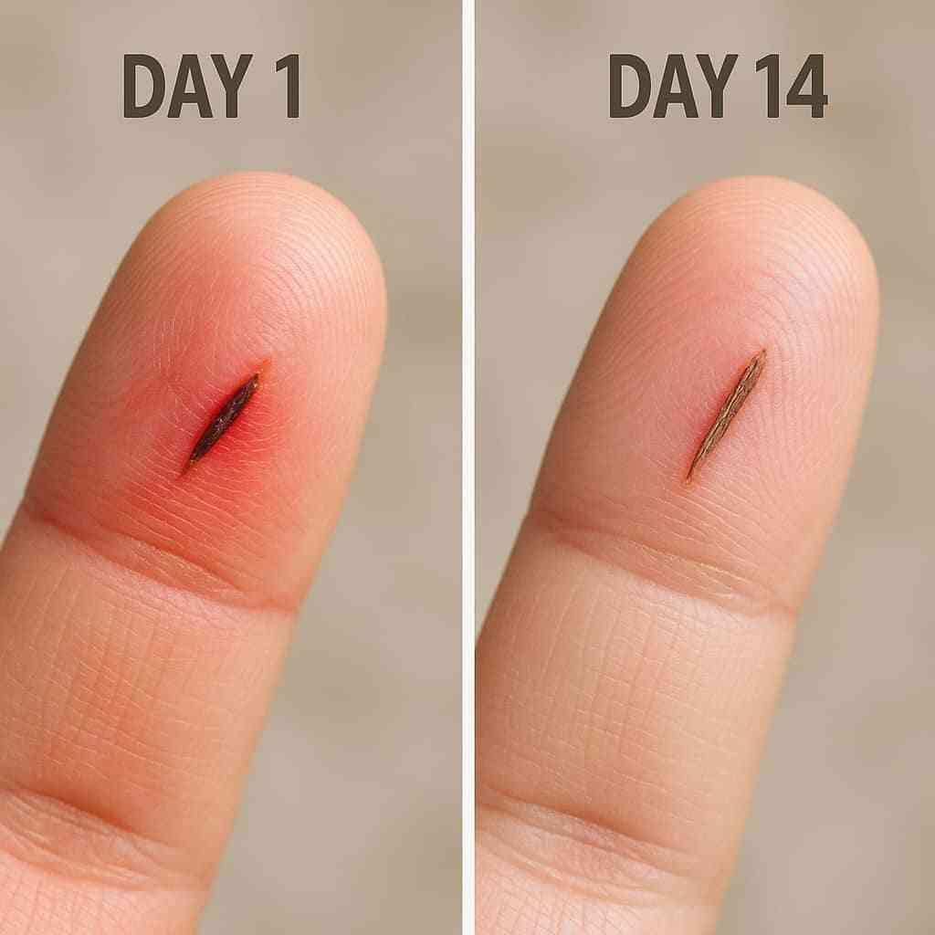 Before and after comparison showing a finger with a deep splinter on day 1 versus day 14, with the splinter visible at the surface ready for removal.