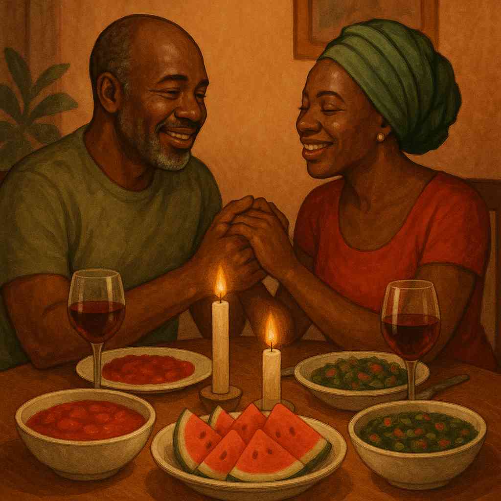 A healthy middle-aged Nigerian couple enjoying a romantic dinner with prostate-healthy foods visible on the table - tomato stew, watermelon slices, and vegetable soup.