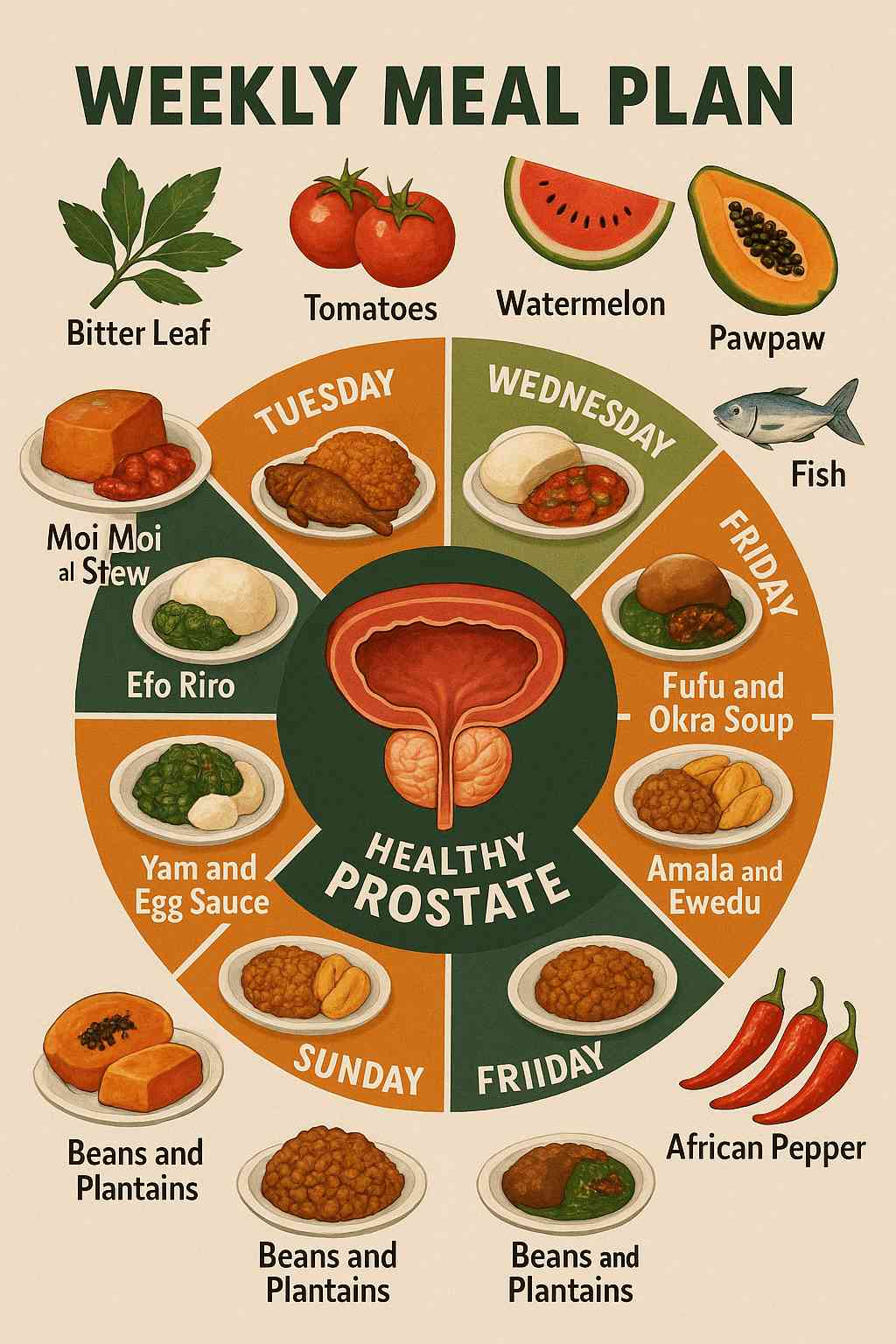 A weekly meal plan with traditional Nigerian foods for a healthy prostate.